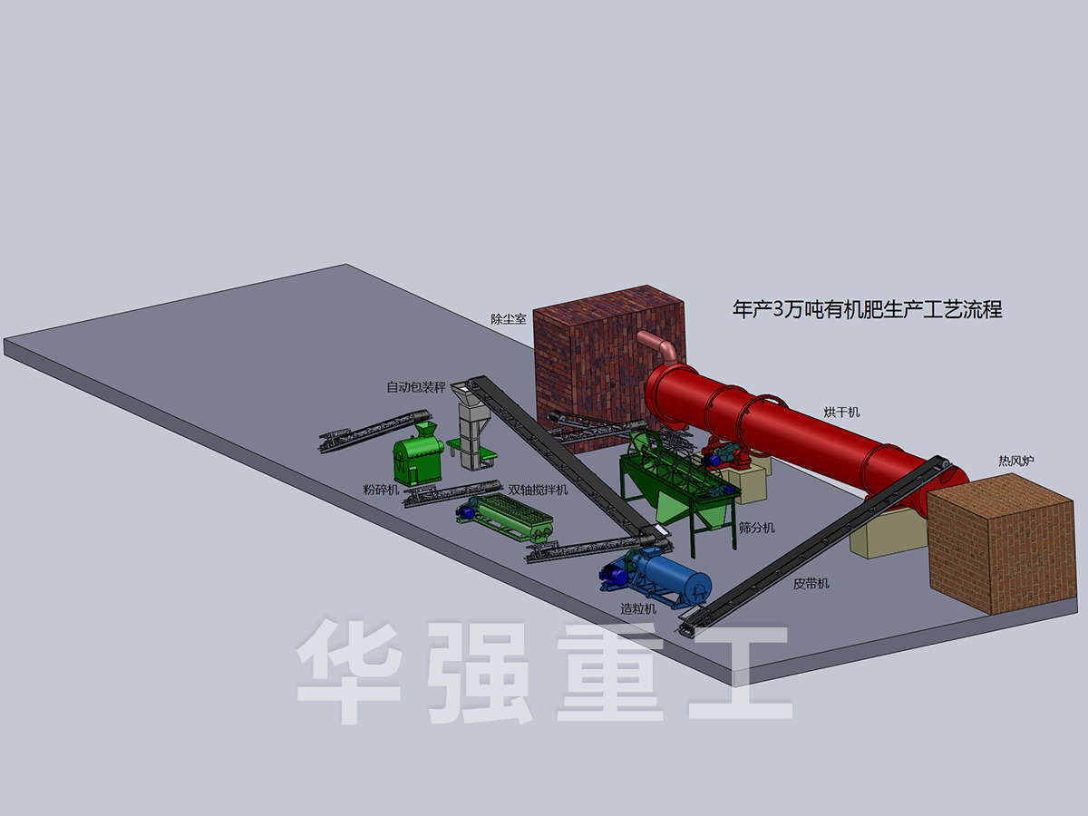 將發(fā)酵好的雞糞有機(jī)肥粉碎篩分后,與黏結(jié)劑及需配伍的其他成分的原料按配比要求在配料混合系統(tǒng)中進(jìn)行計(jì)量、配料、混合,經(jīng)充分混合后的物料由皮帶輸送機(jī)均勻連續(xù)的喂入新型有機(jī)肥造粒機(jī)中,經(jīng)拋光整形機(jī)拋園成球狀顆粒,經(jīng)烘干機(jī)進(jìn)行低溫大風(fēng)量烘干(≤65℃)后進(jìn)行冷卻、篩分,成品顆粒由皮帶輸送到成品料倉(cāng),經(jīng)電腦定量包裝系統(tǒng)計(jì)量、包裝入庫(kù)。
